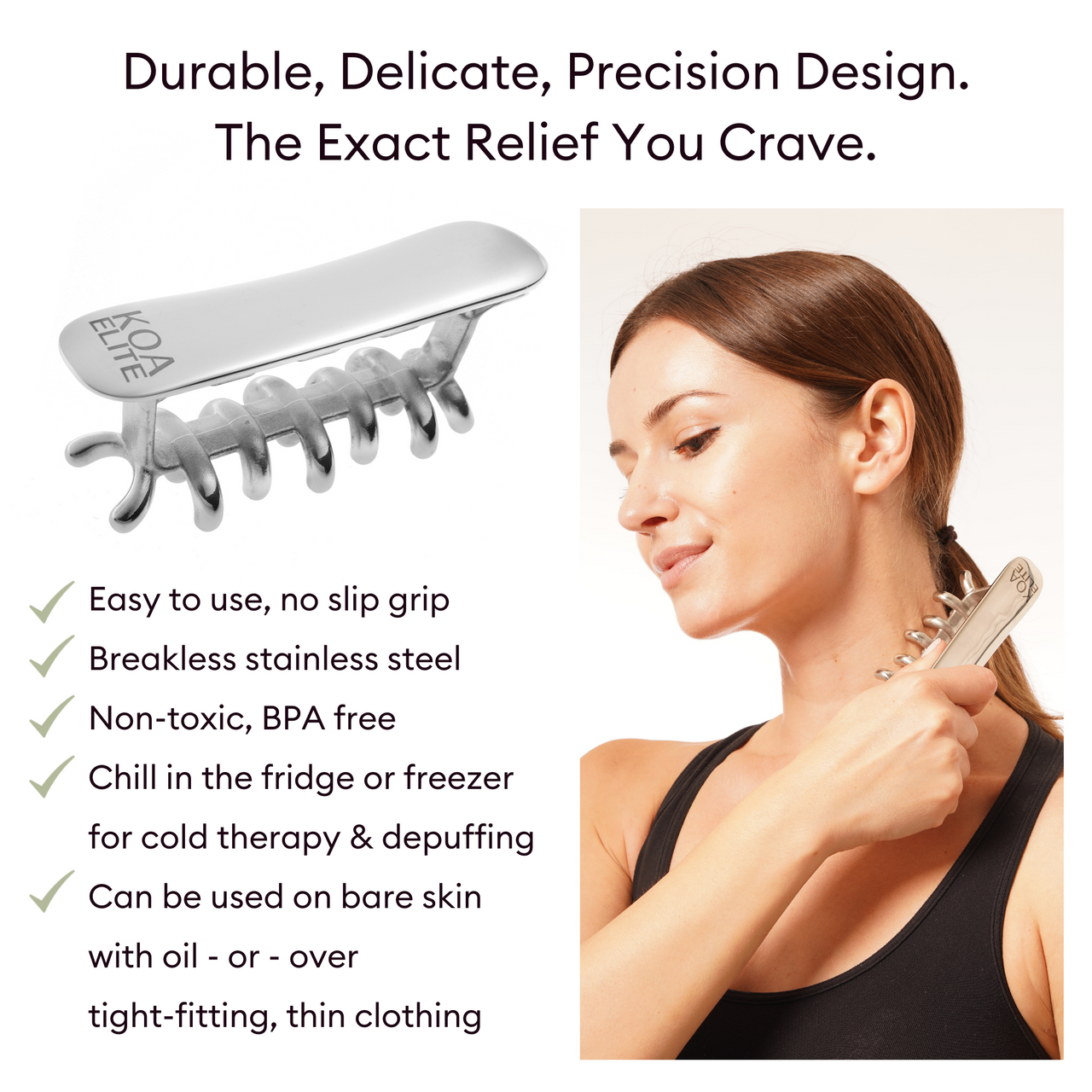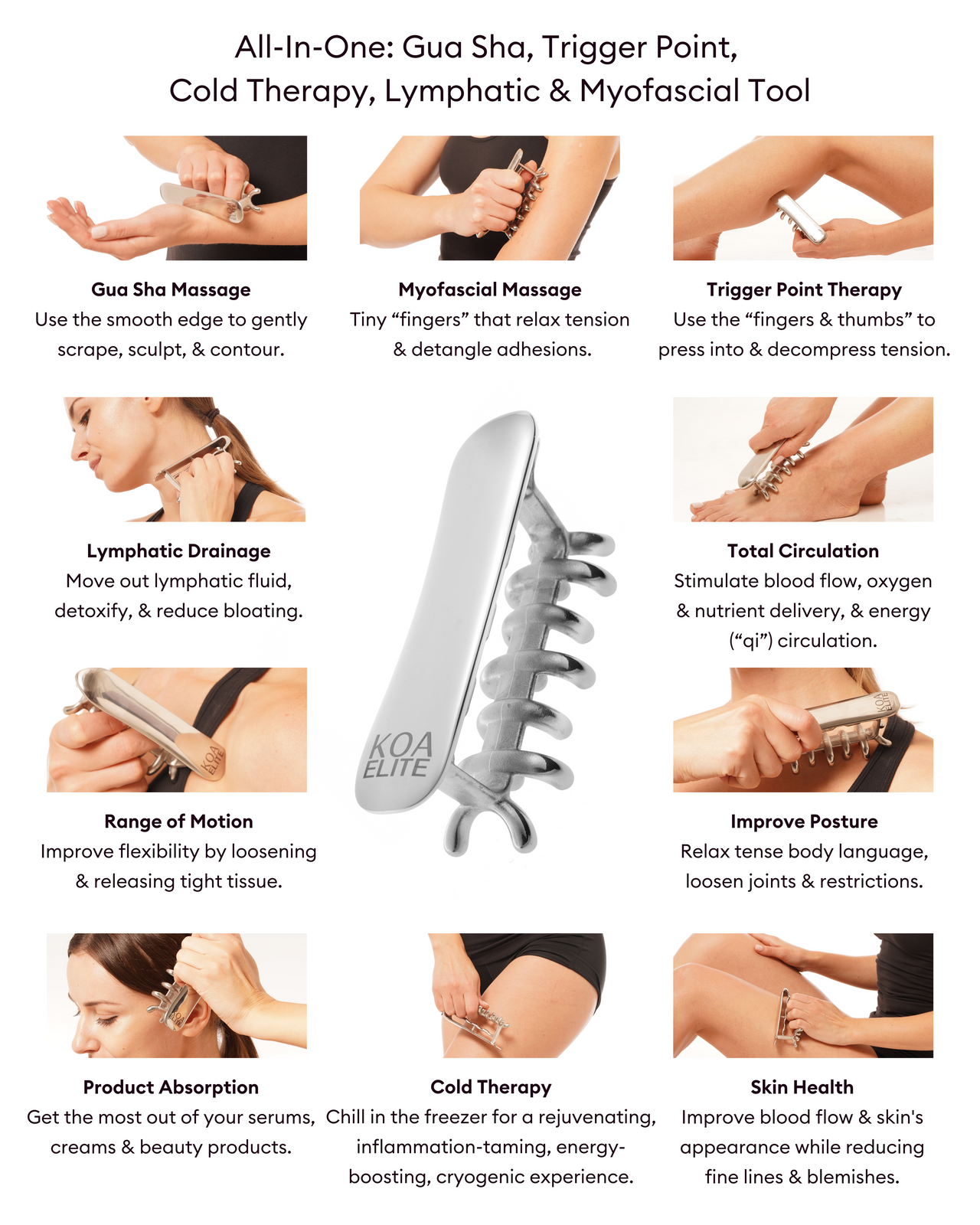 The KOA Massage & Gua Sha Tool decompresses and relaxes tension by targeting the body’s myofascial tissues in a uniquely gentle and effective way. Unlike other massage and Gua Sha tools, our patent-pending HUMANTouch™ technology allows the KOA’s fingers to comb through and release adhesions that cause tension, pain, and dysfunction.